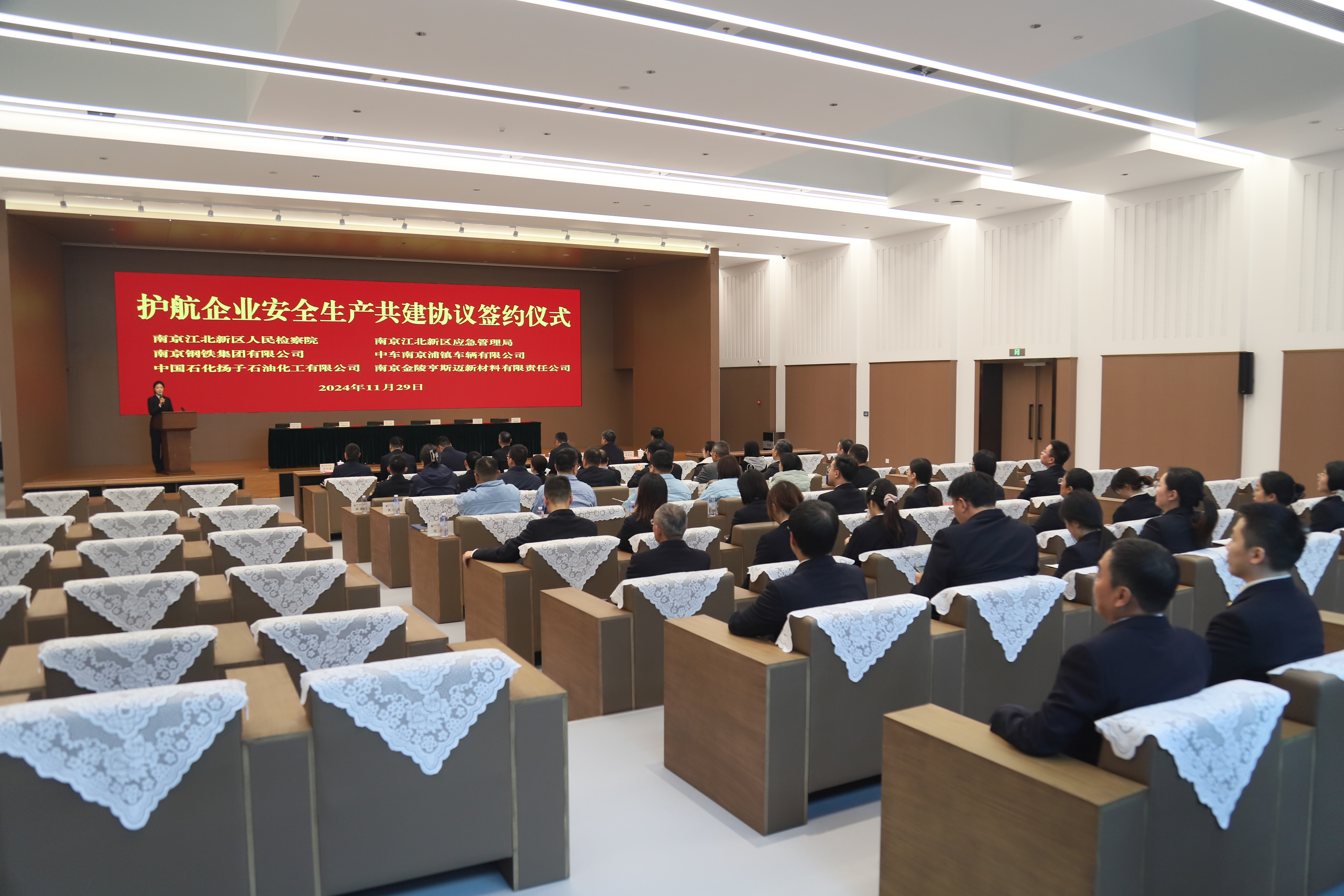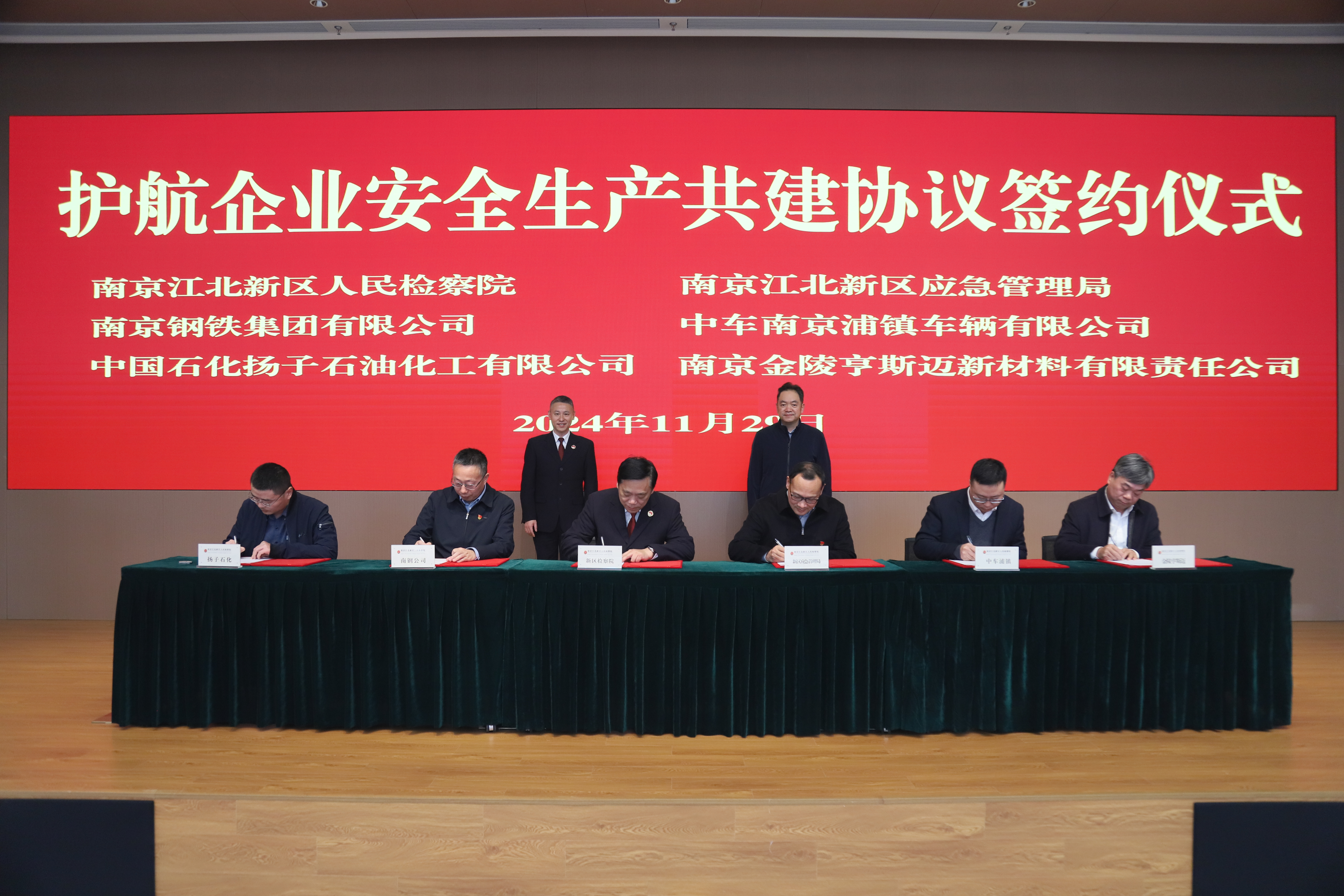 南京江北新区人民检察院分党组书记、检察长梁云,江北新区应急管理局党委书记、局长俞晓飞出席活动。南京江北新区人民检察院副检察长沈明志、江北新区应急管理综合行政执法大队大队长施建军、南京钢铁集团有限公司总经理助理戴祝平、中车南京浦镇车辆有限公司副总经理曹志、南京金陵亨斯迈新材料有限责任公司总经理陈忠基、中国石化扬子石油化工有限公司安全环保部副经理刘军辉共同签署协议。