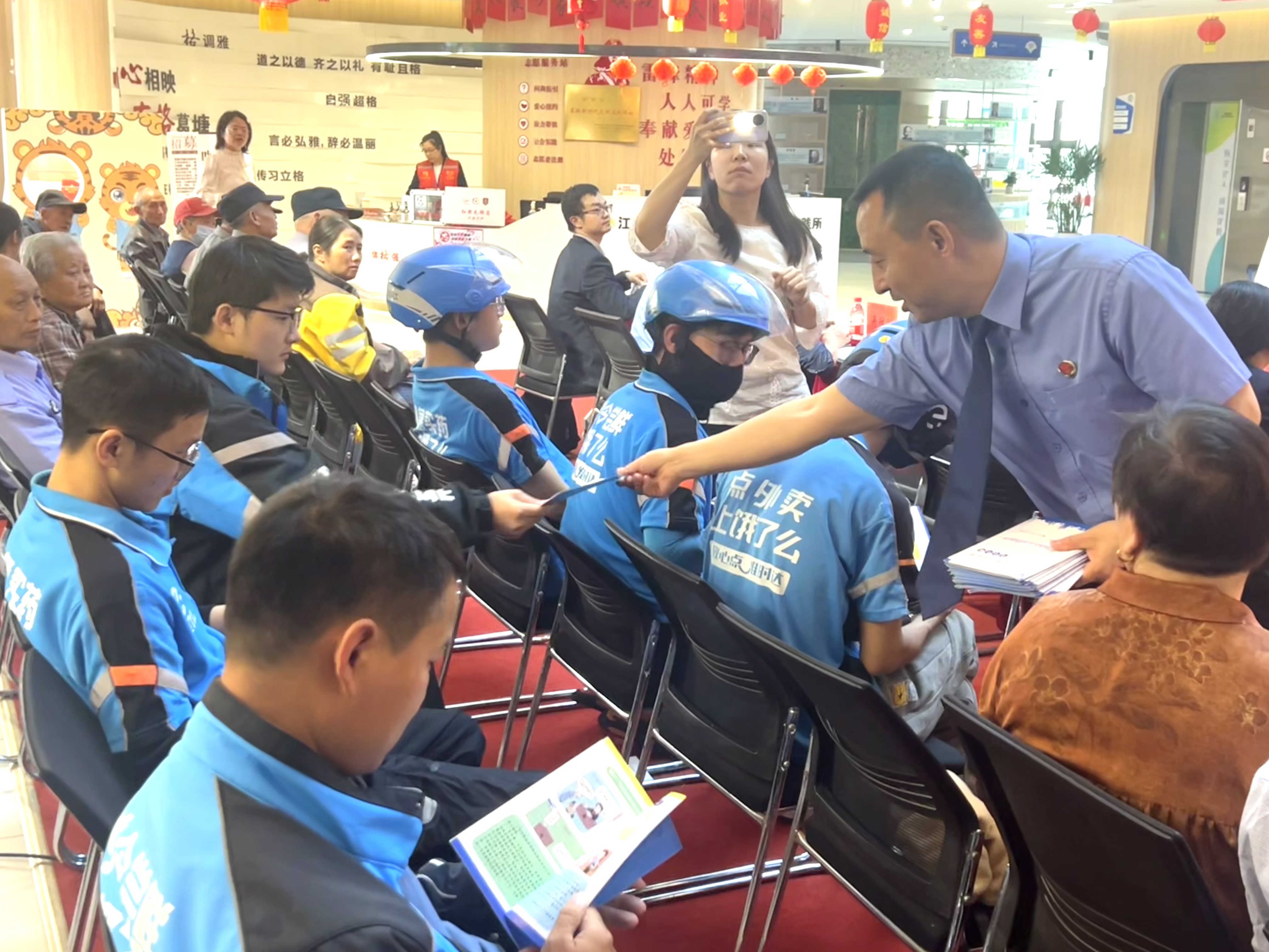 为切实提升新业态劳动者法律意识,在“五一”国际劳动节来临之际,结合全国第五个“民法典宣传月”,2025年4月29日下午,南京江北新区人民检察院协同新区总工会、综合治理局等单位,共同走进葛塘街道新时代文明实践所为辖区内外卖骑手、物业保安、工会工作人员等50余名群众开展“梧桐行·小波热线”法治宣传服务。