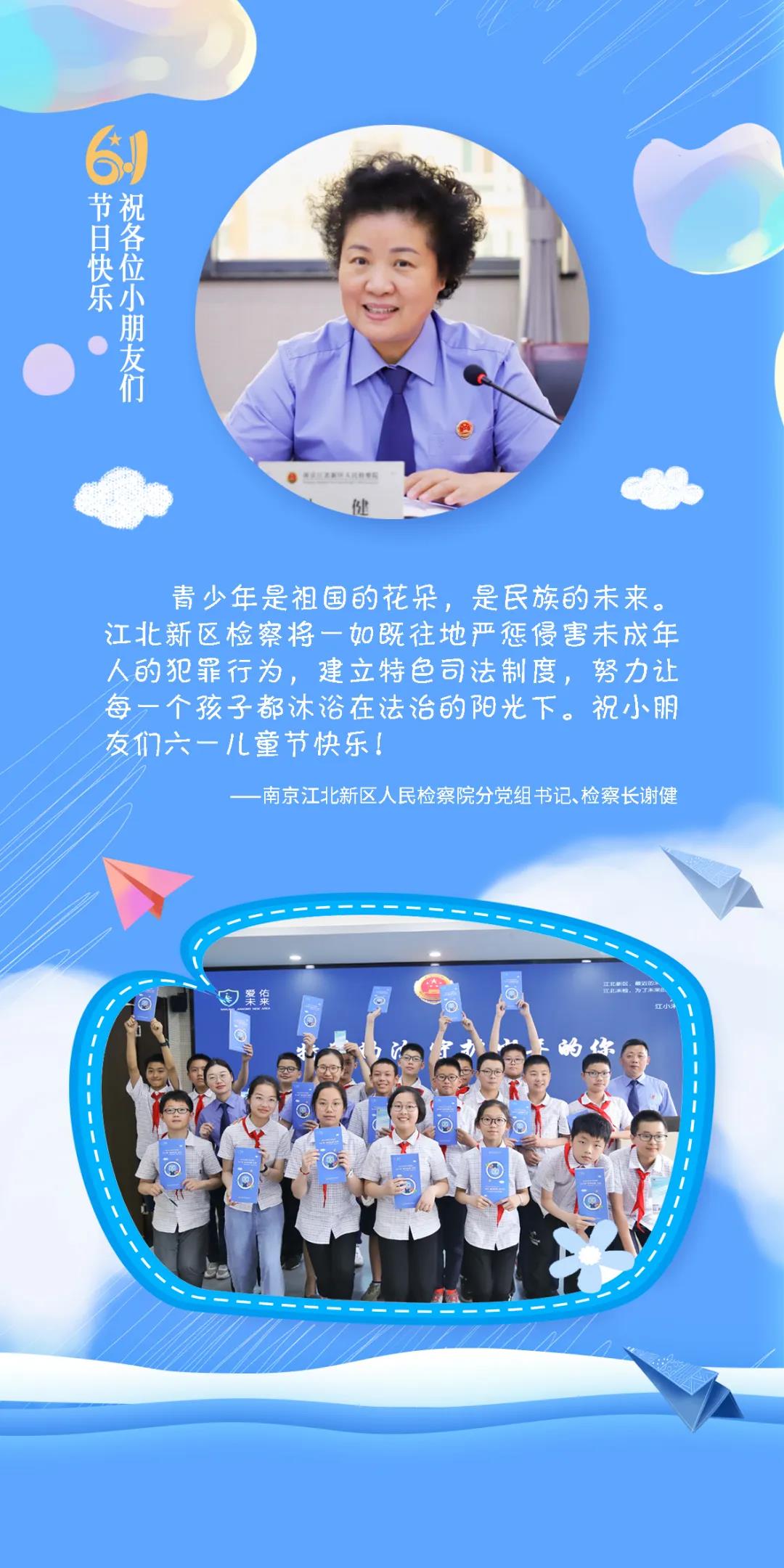 “青少年是祖国的花朵,是民族的未来。江北新区检察将一如既往地严惩侵害未成年人的犯罪行为,建立特色司法制度,努力让每一个孩子都沐浴在法治的阳光下。祝小朋友们六一儿童节快乐!”