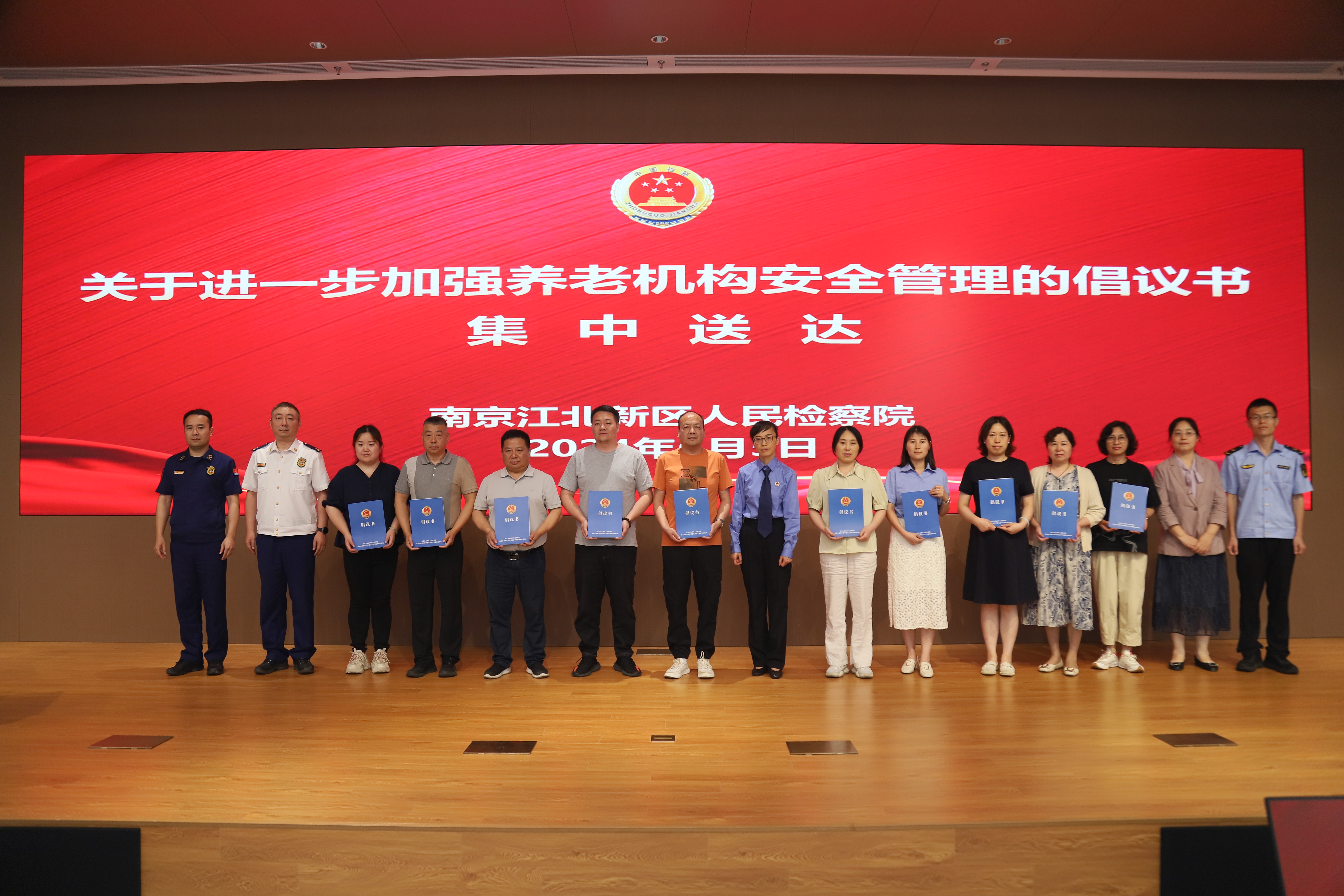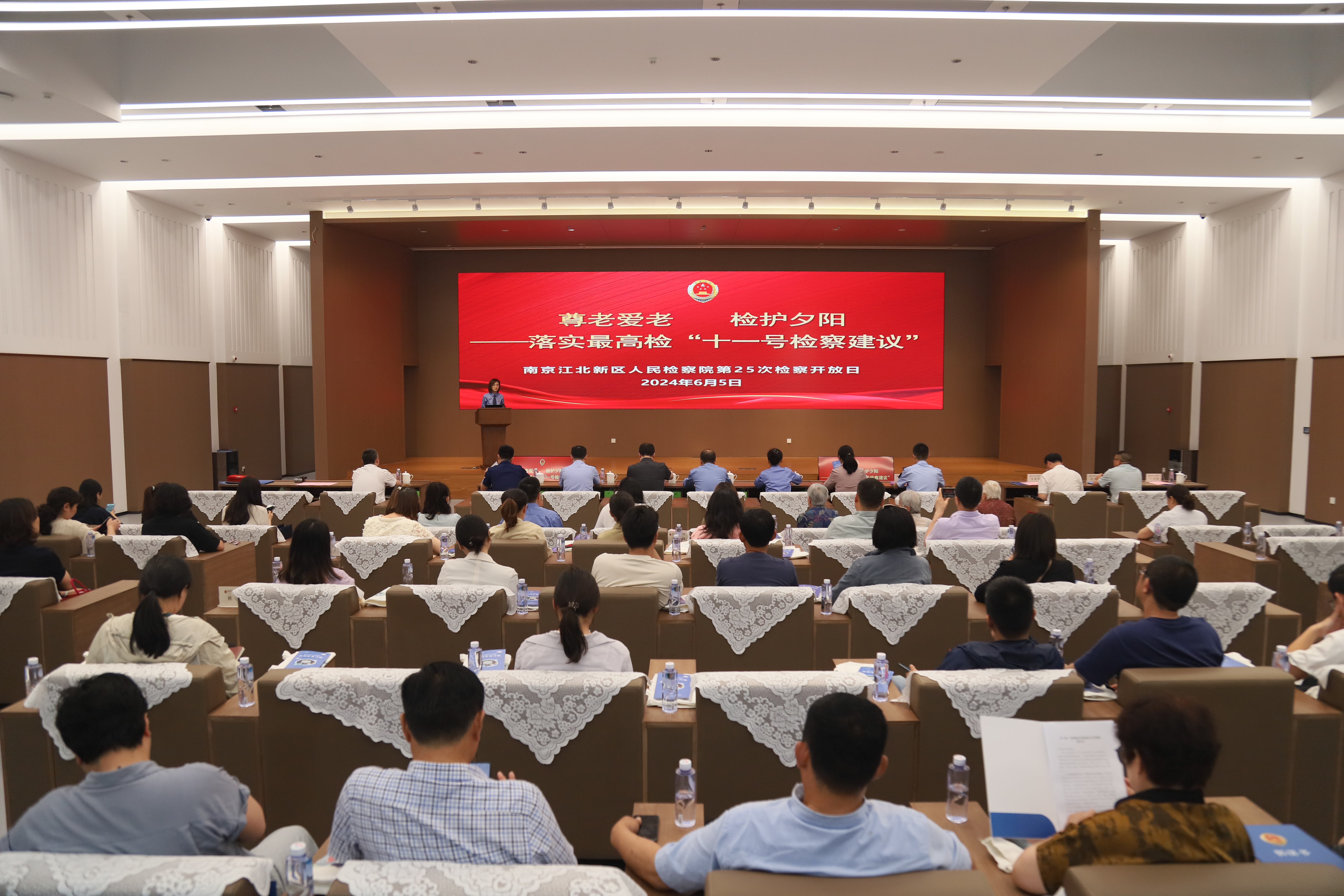 2023年12月,针对养老机构内侵犯老人人身权利问题,最高检向民政部发出“十一号检察建议”,促进养老机构强化安全监管。为推动最高检“十一号检察建议”落地落实,同时深入开展最高检“检护民生”专项行动,切实维护老年人合法权益,6月5日下午,南京江北新区人民检察院举行“尊老爱老,检护夕阳”检察开放日活动,邀请新区法院、公安分局、卫生健康和民政局、市场监督管理局、消防救援大队、街道及养老机构负责人,以及老年人代表参加活动。