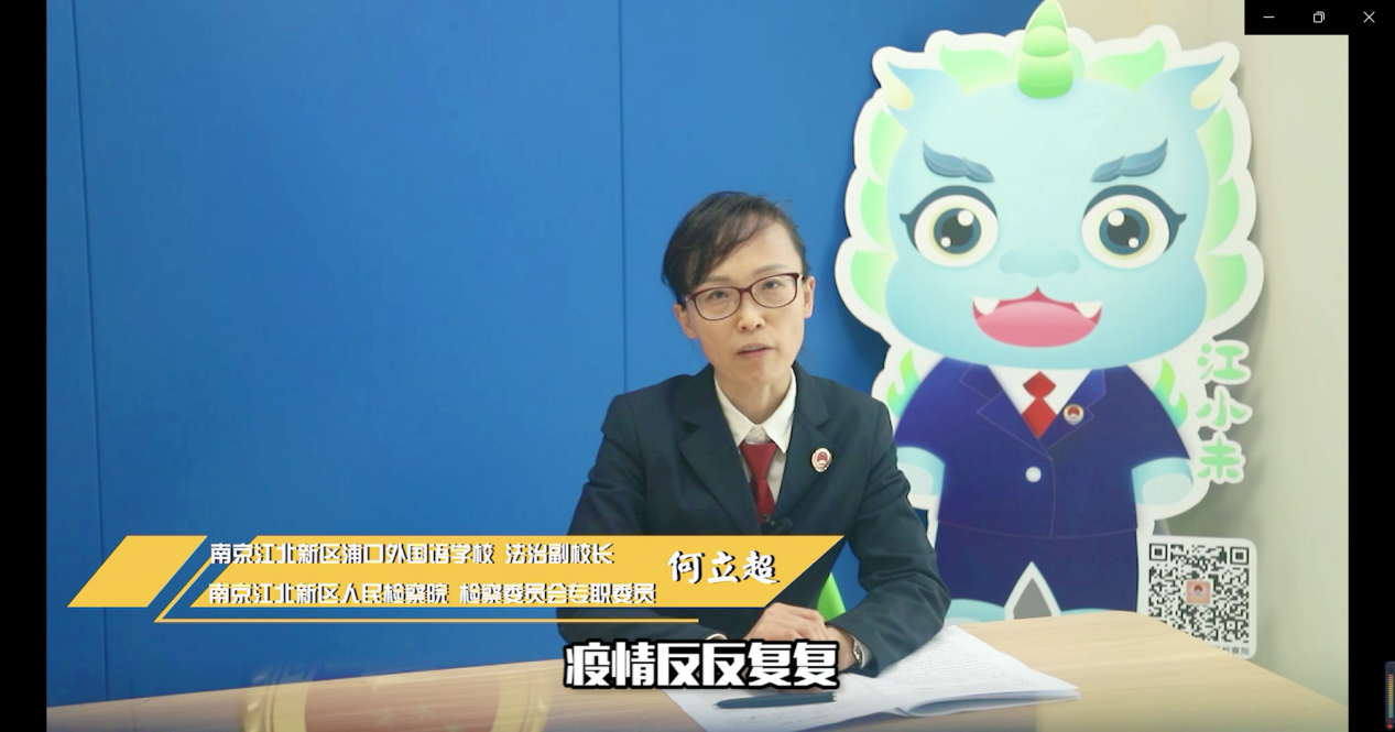受新一轮疫情的影响,全市中小学生开启居家线上学习模式。为进一步提高同学们的法律意识,识破疫情骗局,2022年4月8日,南京江北新区人民检察院检察委员会专职委员何立超作为南京江北新区浦口外国语学校的法治副校长录制了一堂“江小未”法治课——居家学习,“疫”起成长。该课堂以情景剧片段演绎的方式讲解疫情期间的典型案例——冒充防疫人员入户抢劫案、额温枪微信诈骗案、跑腿代购诈骗案。通过三个案例的生动讲解提醒同学们通过官方渠道购买防疫用品,选择规范的支付流程,远离网络陷阱,提高自我保护意识。