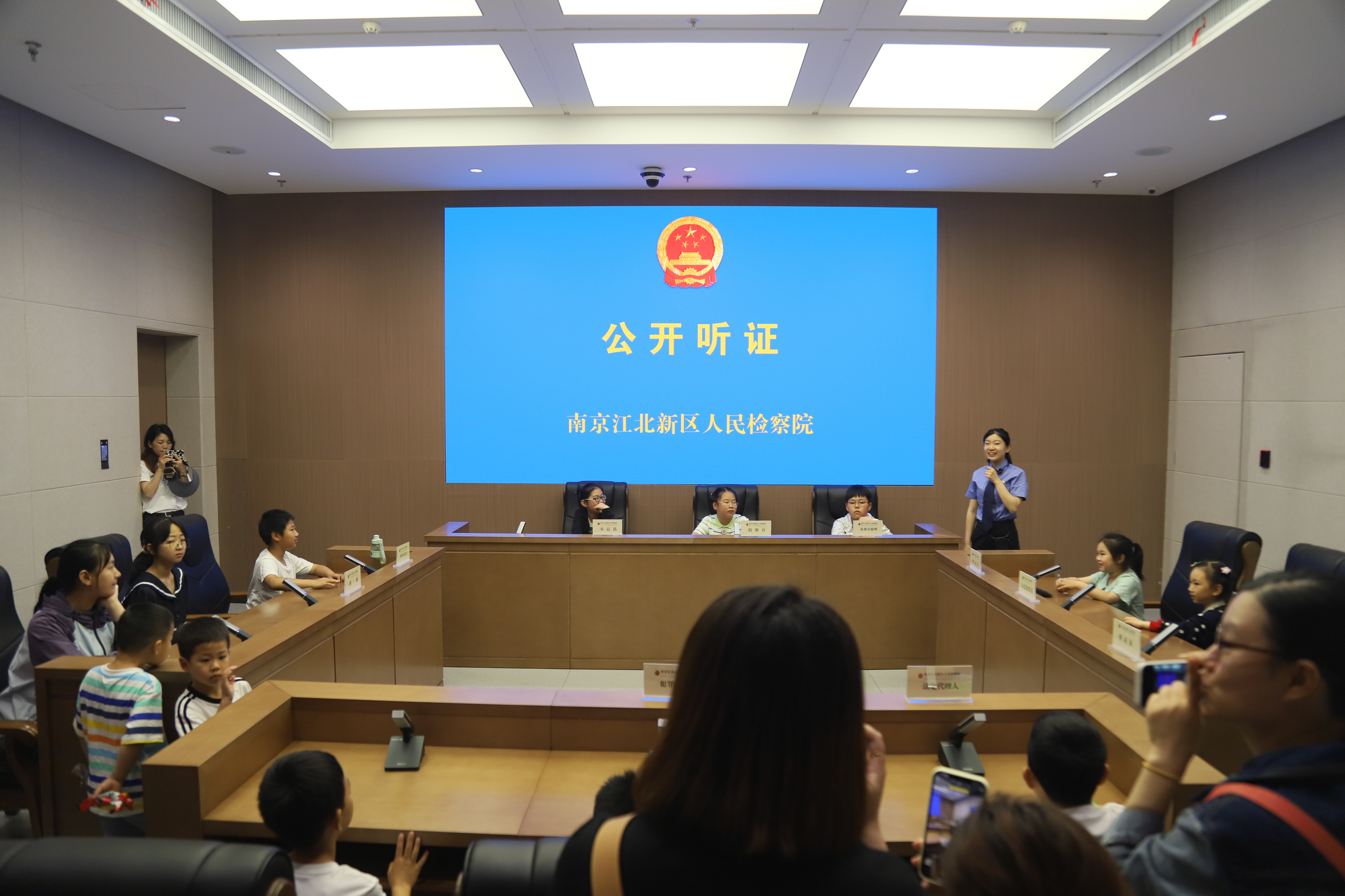 在听证室,孩子们“变身”检察官、律师、听证人员等身份,模拟了一场不起诉公开听证会。“检察官”神情严肃、“侦查人员”“辩护人”悉数到场、“听证员”认真评议……寓教于乐的趣味新体验,让大家深刻了解检察官如何履行检察职能,维护社会公平正义。