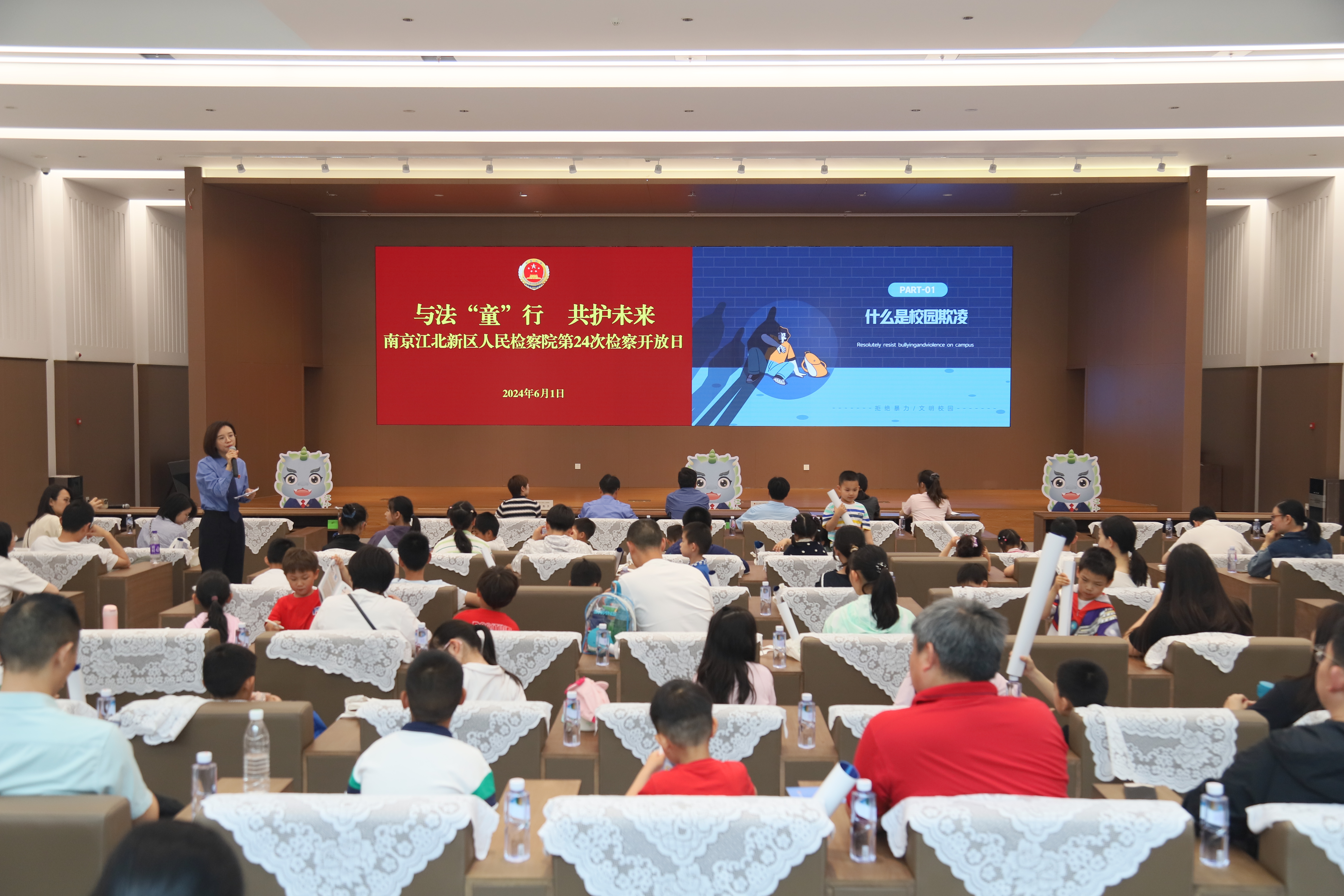 为了进一步加强普法宣传,增强青少年的法治观念,6月1日,在第74个“六一”国际儿童节到来之际,南京江北新区人民检察院携手江北新区法院、南京市律协等单位,邀请学生、家长、老师等100余人走进江北新区检察院,参加“与法‘童’行 共护未来”检察开放日活动,为孩子们送上一份“庆六一”法治大礼包,市人大代表、市政协委员、人民监督员、教师和家长代表参加。