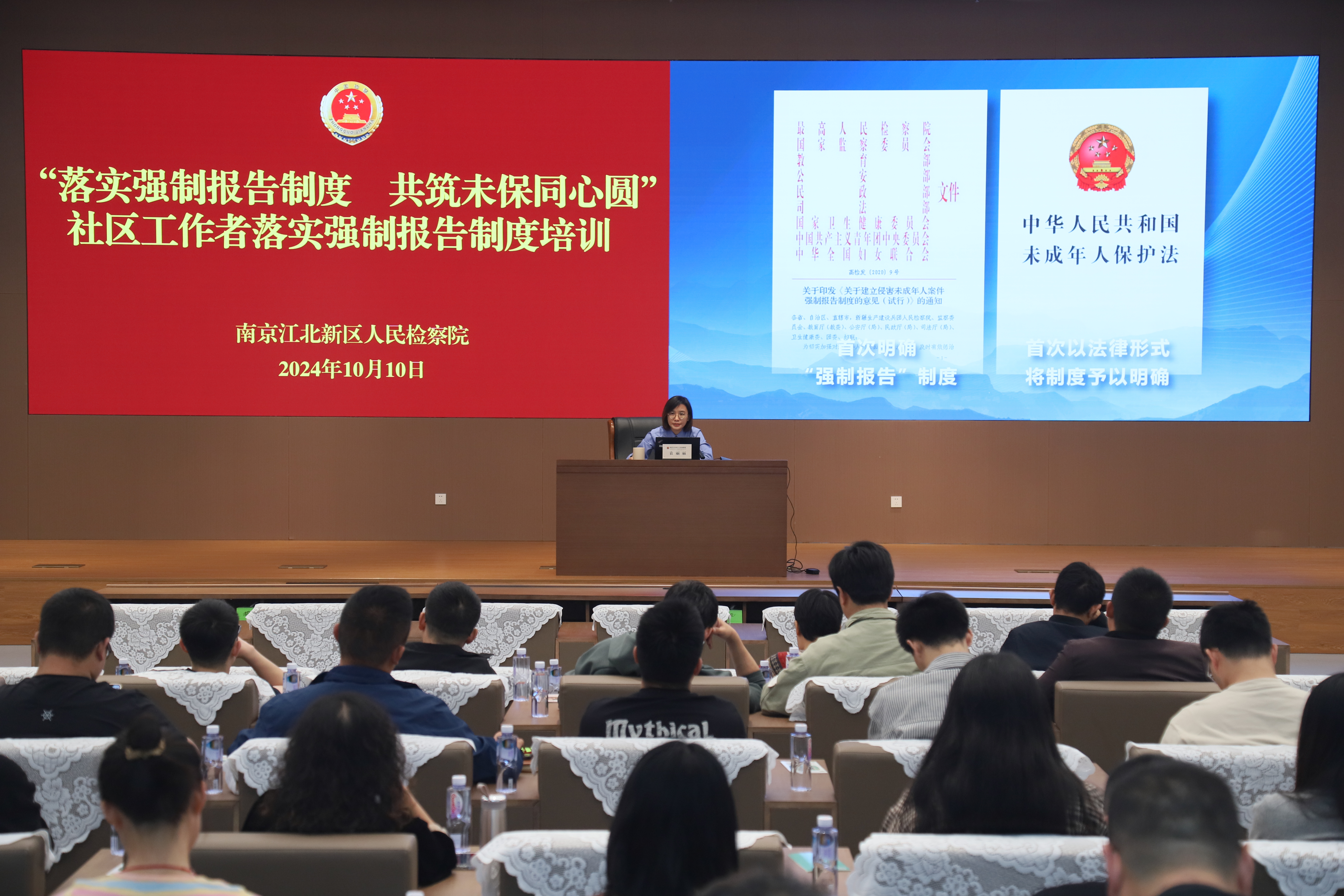 为推进落实强制报告制度,应街道需求,助力相关职能部门提升履职水平,江北新区检察院未成年人检察部门检察官袁丽丽为各街道、社区工作人员开展落实强制报告制度专题培训。