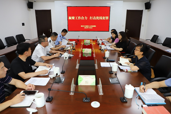 为进一步贯彻落实党中央、国务院关于反洗钱工作的决策部署和高检院关于加强惩治洗钱犯罪工作的要求,认真履行职责,强化衔接配合,持续加大反洗钱工作力度,服务江北新区高质量发展,2022年7月6日下午,南京江北新区人民检察院与江北新区公安分局、人民银行浦口支行就反洗钱工作召开联席会议。中国人民银行浦口支行行长韩加林、江北新区公安分局副局长王海、江北新区检察院检委会专职委员何立超及相关部门负责同志参加会议,江北新区检察院第四检察部全体干警到会参与座谈。