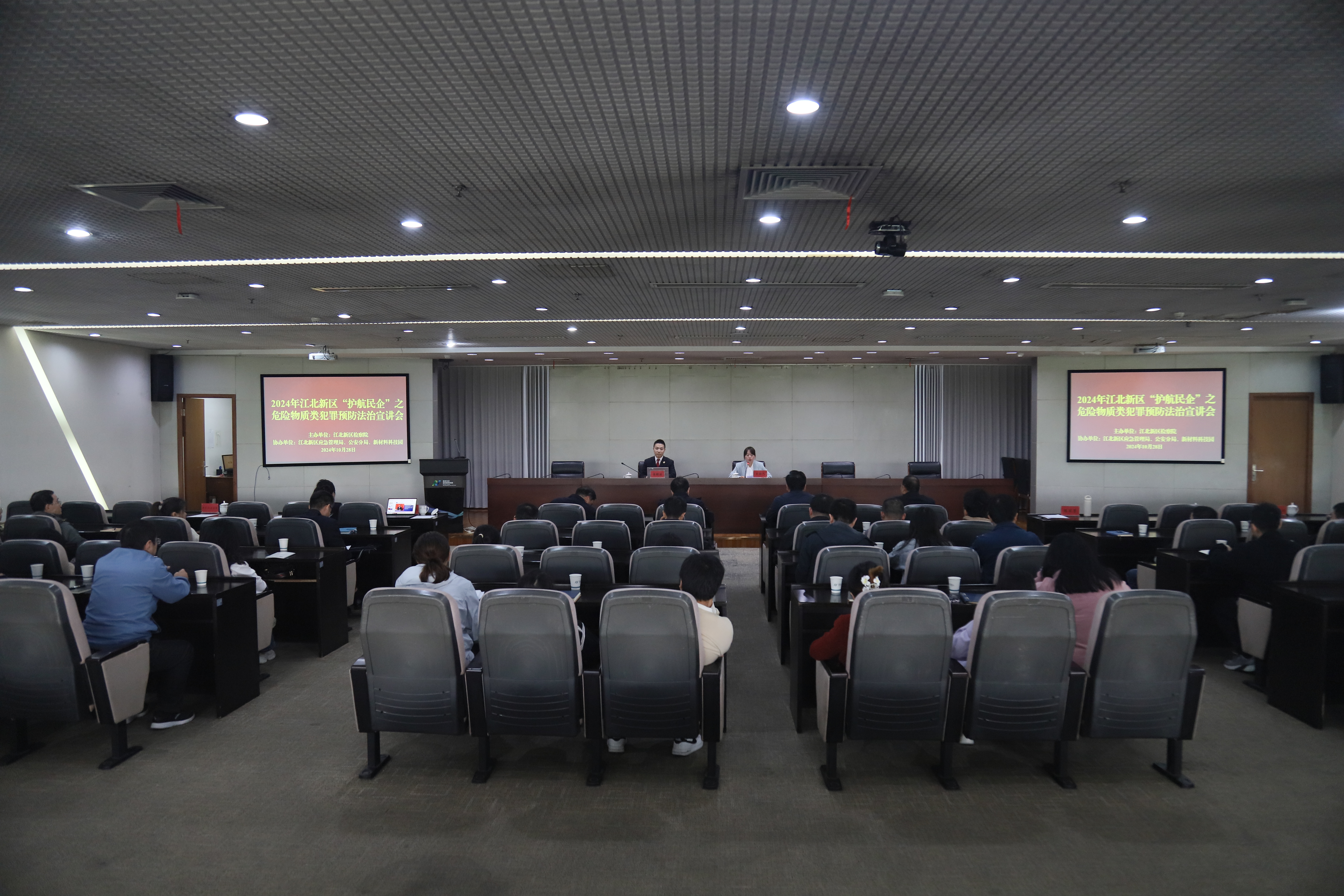 为提升企业危险物质安全生产意识,10月28日下午,南京江北新区人民检察院牵头江北新区应急管理局、公安分局、南京江北新材料科技园,在园区“检察护企工作站”开展危险物质类犯罪预防专题法治宣讲,园区99家研发机构、工贸企业及相关企业主要负责人参加活动。