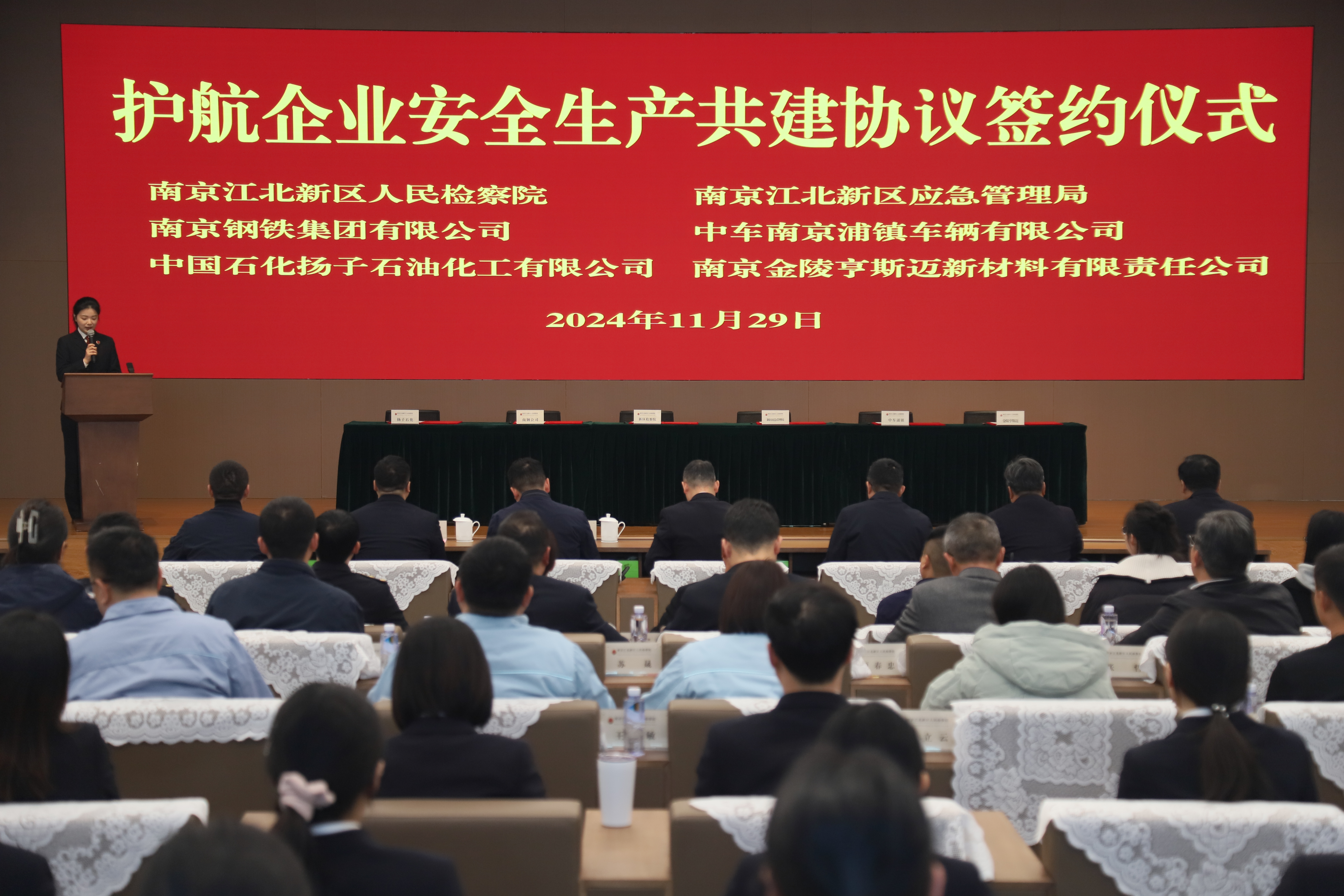 南京江北新区人民检察院分党组书记、检察长梁云,江北新区应急管理局党委书记、局长俞晓飞出席活动。南京江北新区人民检察院副检察长沈明志、江北新区应急管理综合行政执法大队大队长施建军、南京钢铁集团有限公司总经理助理戴祝平、中车南京浦镇车辆有限公司副总经理曹志、南京金陵亨斯迈新材料有限责任公司总经理陈忠基、中国石化扬子石油化工有限公司安全环保部副经理刘军辉共同签署协议。