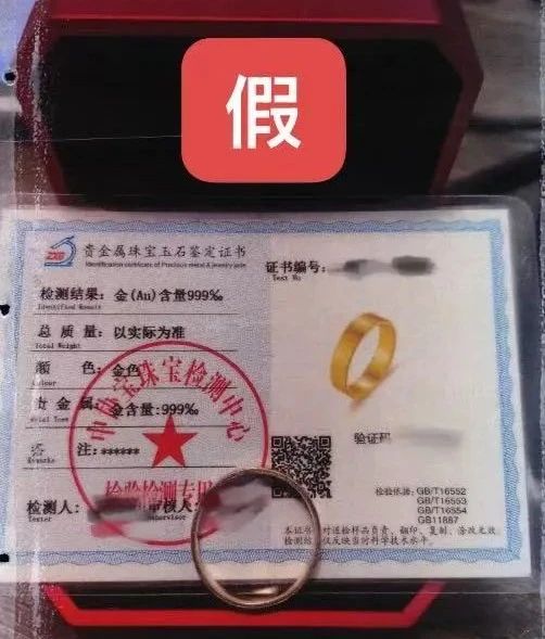 2024年7月,王先生想为妻子买一个黄金戒指作为七夕礼物,由于自己平时也没时间出去逛街,便在一家名为“XX黄金”的淘宝店铺里,选购了一款重量1.8g、标注“足金999”的桔梗花型黄金戒指。然而几天后收到快递的王先生却发现,自己收到的戒指重量很轻,不像是分量很足的黄金。“包装盒里有相应的黄金证书,我就相信了,没多想。”